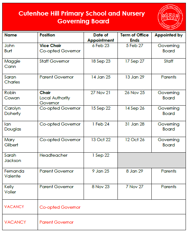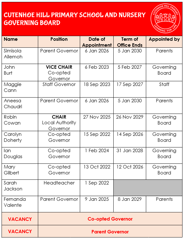 Governors are appointed by the Governing Board except for Parent Governors, who are elected by parents and carers, and Staff Governors, who are elected by school staff.