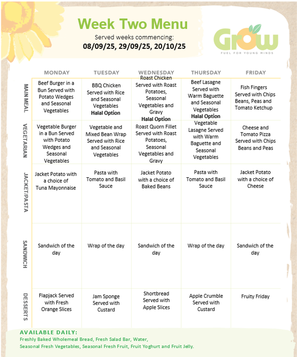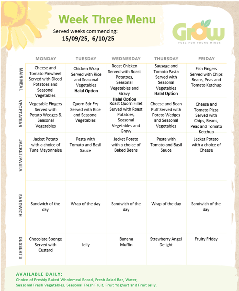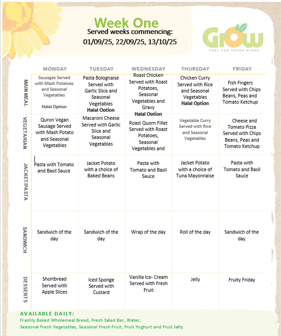 Our school meals offer a wide selection of nutritionally balanced main meals and desserts. We are happy to accommodate any medical or cultural diets. Please inform staff if your child has any specific requirements.
